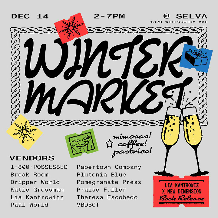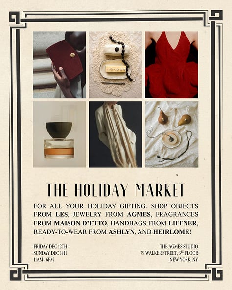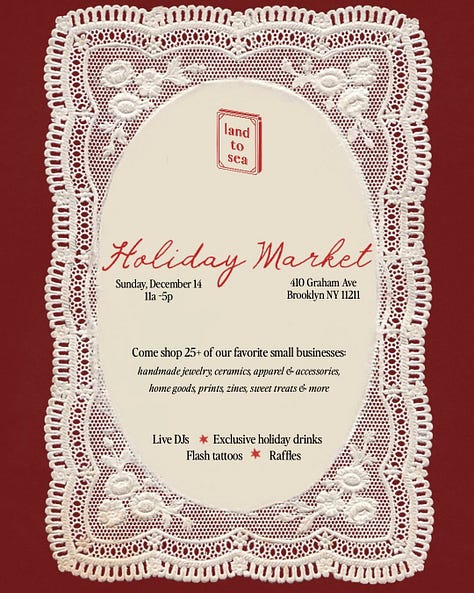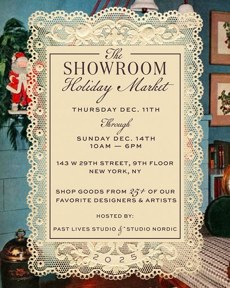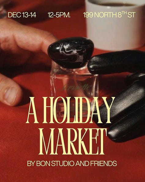 Among end of year madness—the emotional wreckage done by producing content for Kendall Jenner’s home en masse, for example—one thing remains holy to me, which is the peddling of wares. I came across about forty holiday markets before it occurred to me someone should put these all together. Not me, obviously, because I’m neck deep in Kendall Jenner content. I asked my friend Kate Collins, someone who is tasteful, observant, aware of everything at once, to assemble every holiday market we could find between us into one comprehensive list.