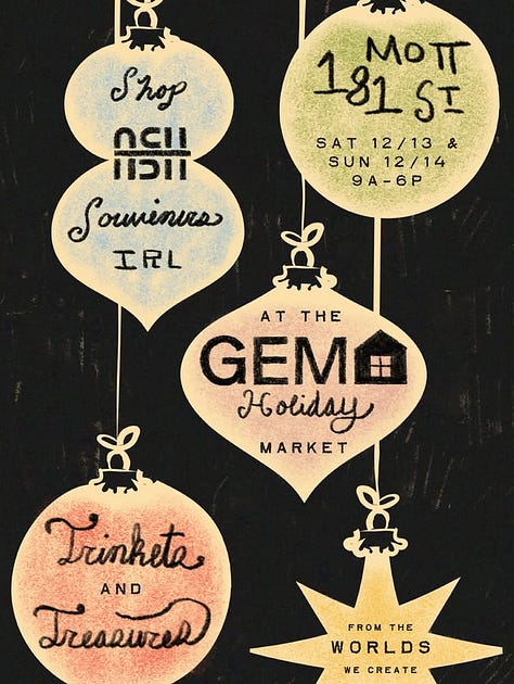 Nota bene from Kate: Skip Union Market, Winter Village, and Grand Central. If you must optimize for efficiency or the goal is to get all your gifts in one go, opt for Chelsea Flea, Grand Bazaar (worth the trip to the UWS), or Brooklyn Flea. I will personally be avoiding Lower Manhattan on Saturday (see: SantaCon) but choose your own adventure.
