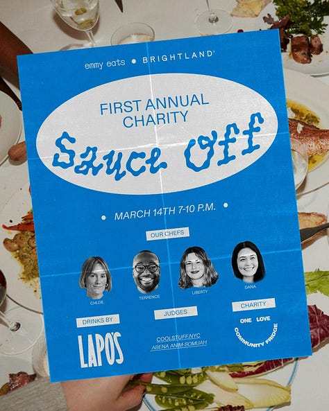 There’s just two spots left to Emmy Eats sauce-off this Saturday (March 14), where four chefs are using Brightland olive oil to whip something up for three special judges (namely Abena Anim-Somuah and coolstuff.nyc). RSVP here.